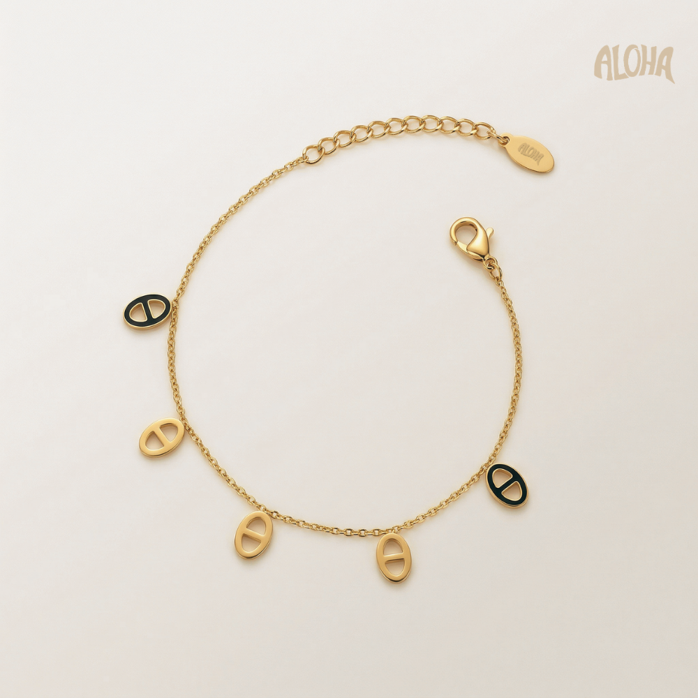 Il est orné de 5 petits charms qui apportent une touche de fantaisie subtile et tendance à votre poignet.